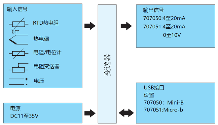 dTRANS T05 B的輸出信號(hào)為4-20 mA或者0-10 V,dTRANS T05 T的輸出信號(hào)為4-20 mA或者0-10 V, 輸入與輸出端之間電氣隔離,兩者的輸出信號(hào)都可以反過(guò)來(lái),可通過(guò)USB接口與電腦連接,不需額外供電,通過(guò)Setup軟件可設(shè)置探頭類型、連接方式、測(cè)量范圍和線性自定義。通過(guò)USB接口,最小/最大過(guò)程值和最小/最大操作溫度可以讀出,傳感器的連線也可以在線檢查。