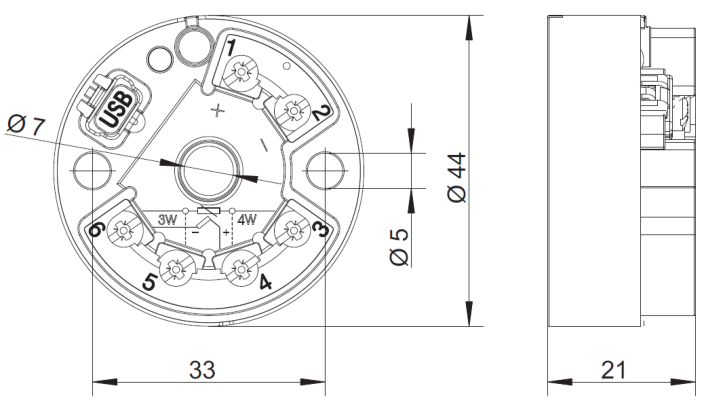 dTRANS T 05 B 端子分配和尺寸(mm)